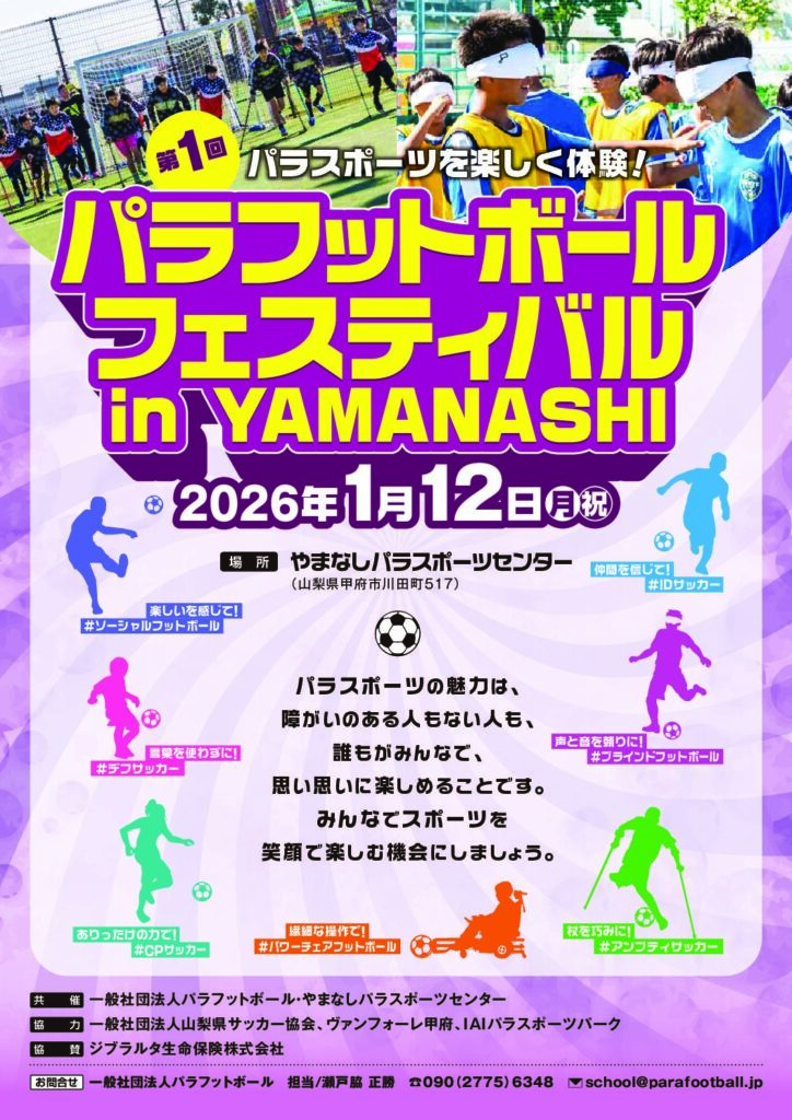 第1回山梨パラフットボールフェスティバル 投稿日: 2026年1月14日2026年2月1日 投稿者: Parafootball 山梨のやまなしパラスポーツセンターで、パラスポーツフェスティバルを行いました。